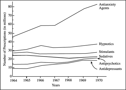 (2) The prescription market. This market delivers barbiturates and other sedatives and hypnotics, minor tranquilizers (antianxiety drugs), amphetamines and other stimulants, and antidepression drugs plus some narcotics. In 1964, 149 million prescriptions (including refills) for psychotherapeutic drugs were filled in American drugstores. During the next six years, such prescriptions increased by about 7 percent a year, to a total of 214 million in 1970. 1 The great bulk of the increase, however, was accounted for by antianxiety drugs, as shown in Figure 13 below. In 1970, minor tranquilizers accounted for 38.8 percent of all psychotherapeutic drug prescriptions and refills, hypnotics ("sleeping pills") 17.5 percent, stimulants 13.2 percent, sedatives 11.1 percent, and antidepressants 9.2 percent. The remaining 10.2 percent were for antipsychotic drugs (major tranquilizers), not covered in this Report.