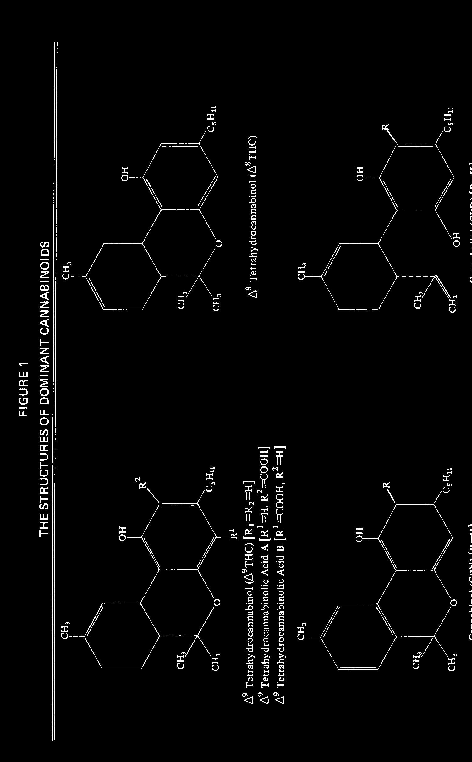 In fresh green plants, the cannabinoids are primarily present in carboxylic acid forms, which are changed into the corresponding neutral compounds by aging or heat (for example, burning or cooking).159, 174 THC acid (THCA) for example, is apparently psychotropically inactive, and must be decarboxylated to THC prior to administration in order to produce significant effects. It has been suggested that some decarboxylation occurs in living plants growing in the tropics.420 Hashish, perhaps because of its age or conditions of treatment generally contains a smaller proportion of cannabinoids in acid form. It would appear that CBD may be a precursor compound to the psychoactive THC. CBN is not normally found in living plant material and its presence in marijuana and hashish generally represents post-harvest cannabinoid transformation. CBN content of cannabis materials might be used as a rough index of age, although other harvest and storage conditions are also likely to affect CBN concentration, and other degradation products of THC may also occur.