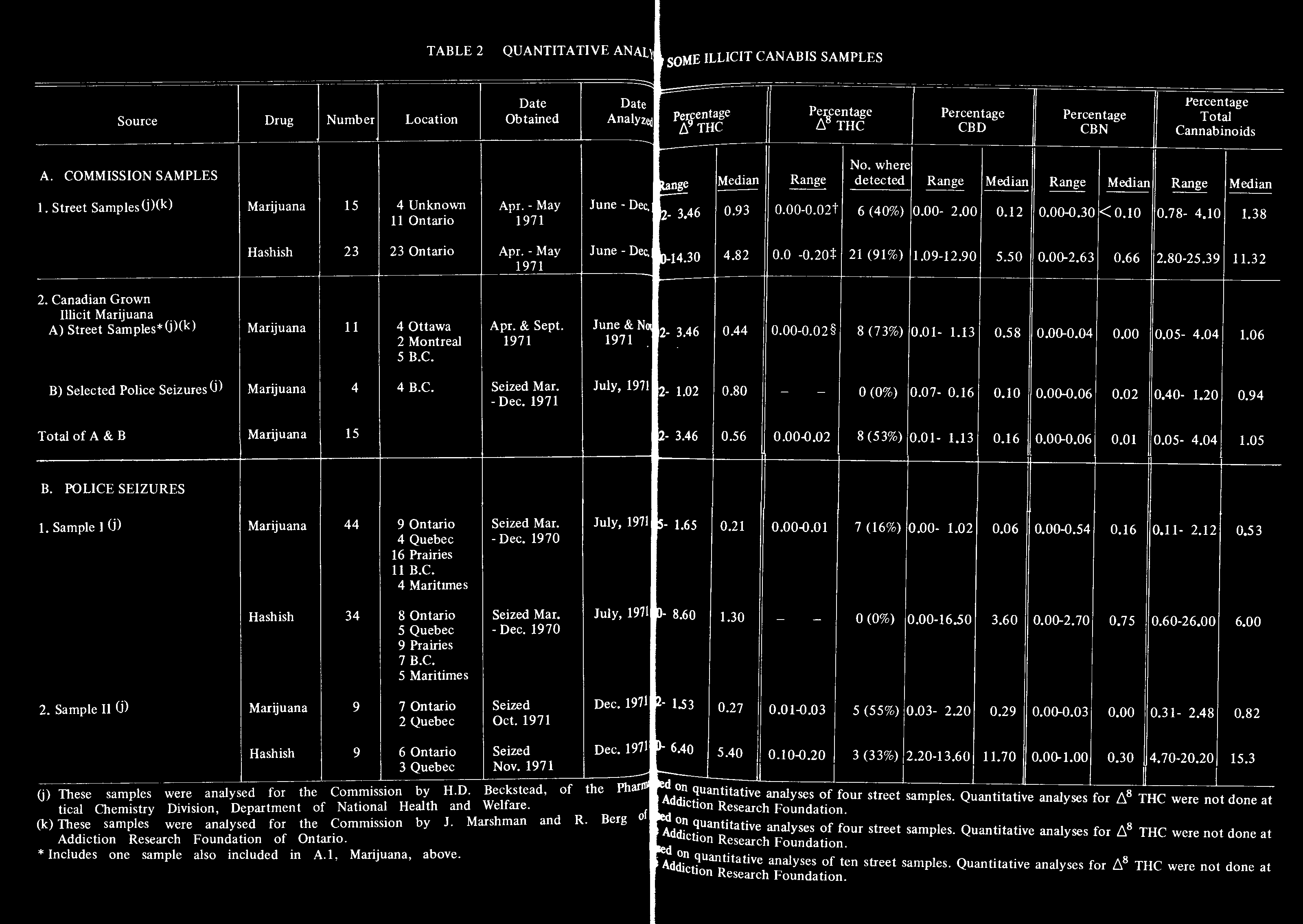 The qualitative data are summarized in Table 1. The police seizures analysed were selected from cannabis samples in storage in the vaults of the Bureau of Dangerous Drugs.[i] In addition, fifty-two cannabis samples were analysed which had been submitted to the Commission by private individuals.[j],[k] Furthermore. we surveyed all the major analytic facilties in the country for cannabis information. Of 259 samples of alleged cannabis, one sample of marijuana was mixed with PCP (phencyclidine), one was marijuana and LSD, one was hashish and tobacco, two cases were non-cannabis plant material containing atropine-like alkaloids (perhaps Jimson Weed [datura]), one was aspirin (A.S.A.), and, in two instances, opium was presented to the analyst as hashish. Twenty-one cases were reported where no drug was found on analysis. Eighty-eight per cent of the samples were cannabis, as alleged. These figures are generally similar to those published previously by Marshman and Gibbons at the Addiction Research Foundation.403 H.D., Beckstead, Dominion Analyst at the Health Protection Branch of DNHW in Ottawa, has reported seeing no cases of cannabis adulterated with other drugs in over 1,700 samples (mostly police seizures) over the past two years, although inactive (non-drug) samples were occasionally observed.43 It should be noted, however, that forensic analyses are primarily concerned with identifying suspected prohibited substances and do not generally make a special point of searching for contaminants. No cases of 'opiated' hashish or marijuana, alleged to be pure, have ever been chemically documented in Canada in spite of the popular impression that this is an established combination. Four separate samples presented to the Commission as evidence of 'opiated hash' were found to be pure cannabis resin. There have been no systematic analyses for insecticides, herbicides or infectious micro-organisms in illicit cannabis in Canada, however, and these remain a potential threat.