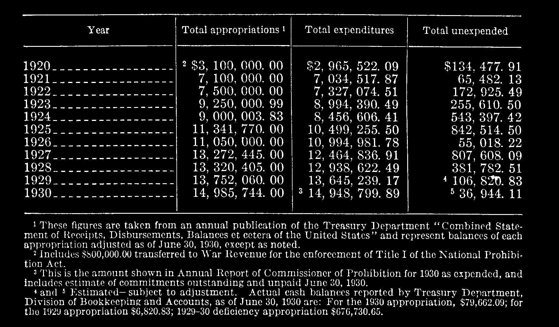 These figures do not represent the total expenditures for prohibition enforcement. The expenditures for the Bureau of Customs, Coast Guard and other services directly or indirectly connected with prohibition enforcement many of which have been necessarily increased to a greater or less extent to meet the additional burdens imposed by the National Prohibition Act, do not appear in the foregoing figures.
